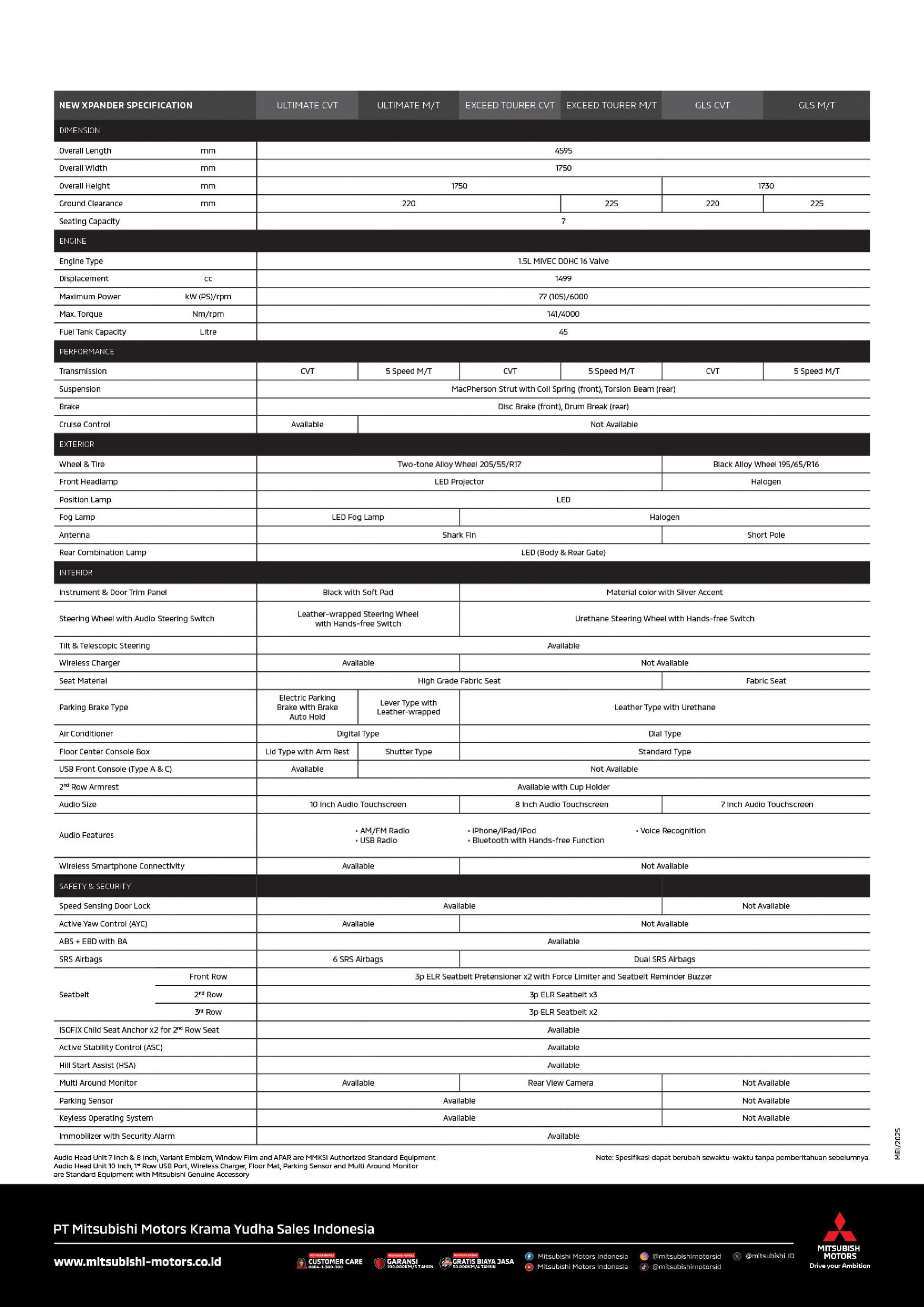 MPV Modern dengan Desain Premium dan Fitur Canggih Mitsubishi New Xpander adalah MPV keluarga yang dirancang dengan desain dinamis, interior mewah, dan fitur inovatif. Menggabungkan kenyamanan berkendara dengan performa andal, New Xpander menjadi pilihan terbaik untuk keluarga modern yang membutuhkan kendaraan serbaguna dan stylish. Desain Eksterior Elegan: Interior Nyaman dan Luas: Performa Tangguh: Fitur Keamanan Modern: Kenyamanan Berkendara: Mitsubishi New Xpander adalah MPV multifungsi yang menawarkan kenyamanan, keamanan, dan performa terbaik. Cocok untuk perjalanan keluarga maupun kegiatan sehari-hari, kendaraan ini menjadi solusi sempurna untuk kebutuhan mobilitas Anda.Mitsubishi New Xpander
